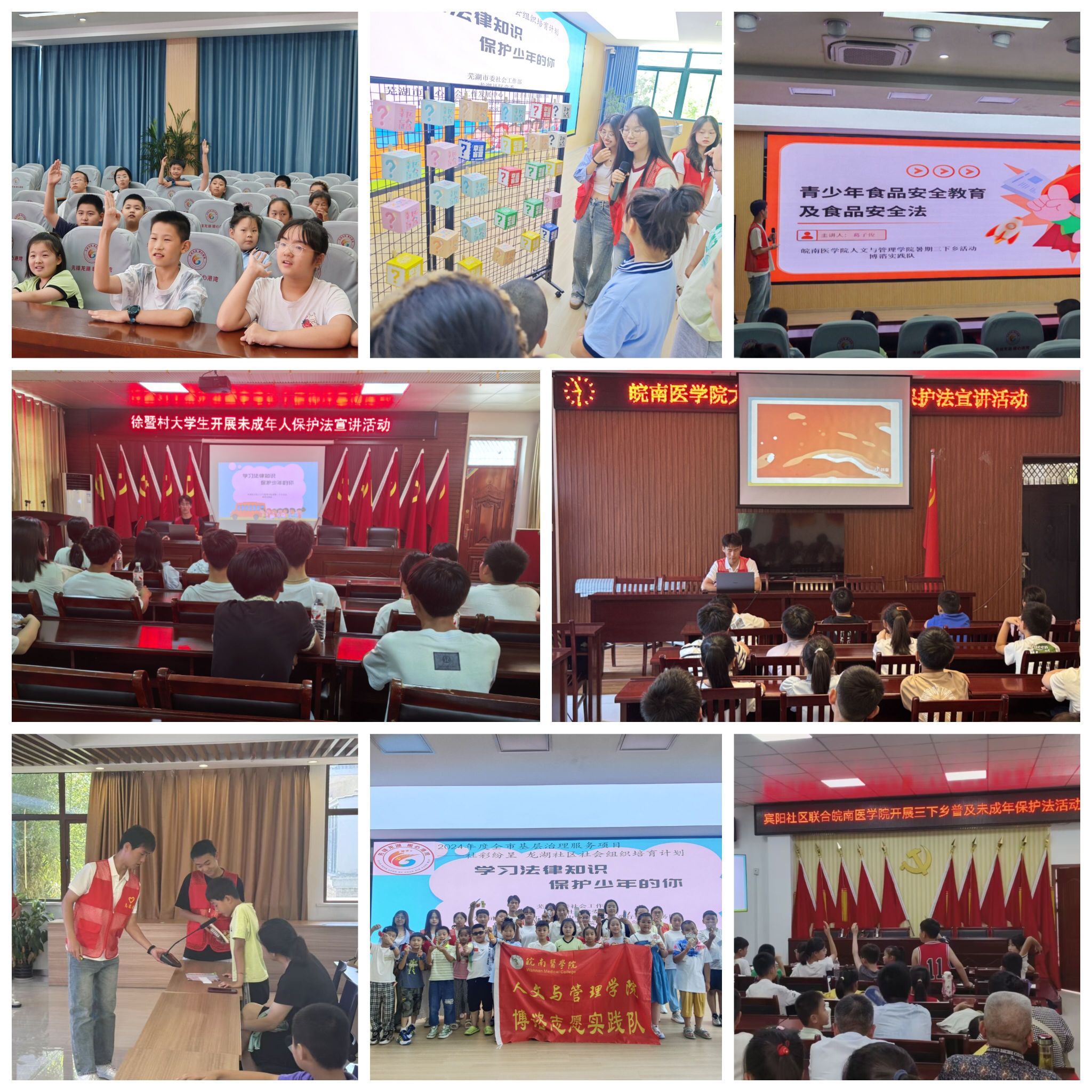 青春法治基层行,播撒种子育未来。为提升青少年群体的安全防范意识和自我保护能力,“博谘·青春法治行”实践队跨越芜湖、淮南两市,围绕《中华人民共和国未成年人保护法》《中华人民共和国食品安全法》等主题,为青少年带来生动普法课堂。队员们将抽象法条转化为易懂语言,以喜闻乐见的形式播撒法治种子,增强了青少年的法律意识和自我保护能力,为营造尊法学法守法用法的社会风尚贡献了青春力量。
