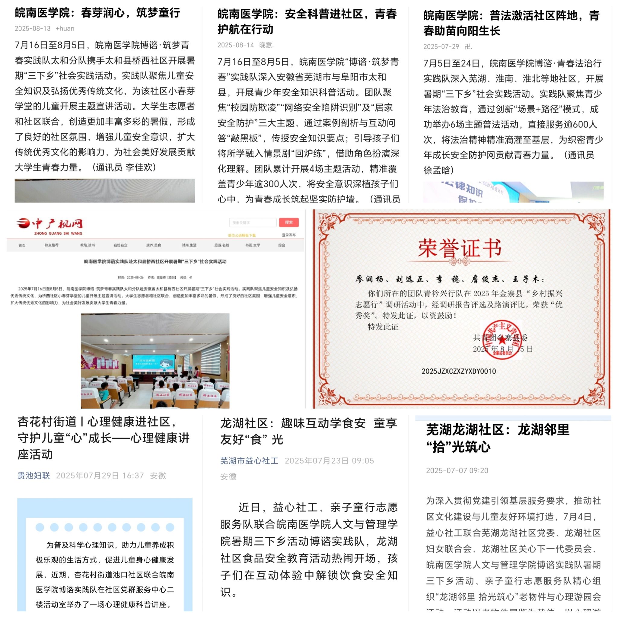 青春实践绽芳华,砥砺前行谱新篇。 七支队伍,七个方向,共同书写了2025年暑期“三下乡”社会实践的绚丽篇章。活动不仅将知识、技术与关怀送到基层,更让同学们在广阔天地中磨练意志、增长才干,深刻理解了“国之大者”。公司将持续深化实践育人体系,引导更多学子将课堂学习与社会实践紧密结合,为“健康中国”和乡村振兴战略实施贡献更多的皖医人的智慧与力量。(杨依婷、廖润杨等/文 王雨晨等/摄)