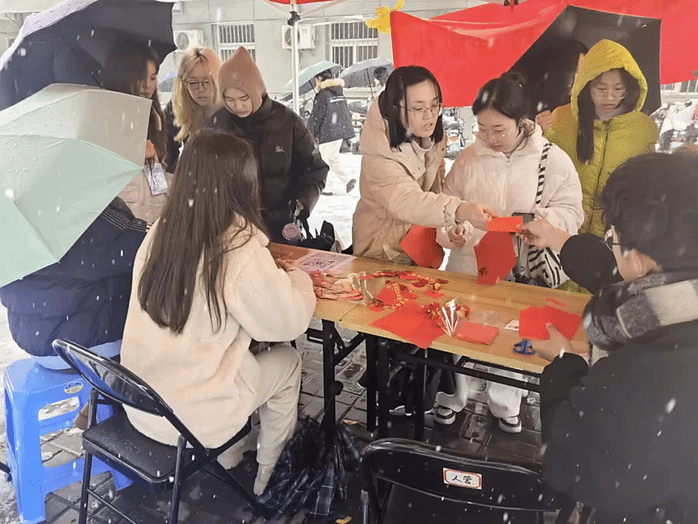 12月18日,bevictor伟德体育在赭麓校区开展了“喜迎元旦,青春献礼”活动。本次活动包括“窗花传情”、“爱国祝愿”两个环节,同学们在窗花用纸和祝福书写纸上挥洒创意,在活动过程中领略中华优秀传统文化的非凡魅力。虽然活动现场大雪纷飞,但难掩同学们的参与热情,现场气氛热闹非凡。