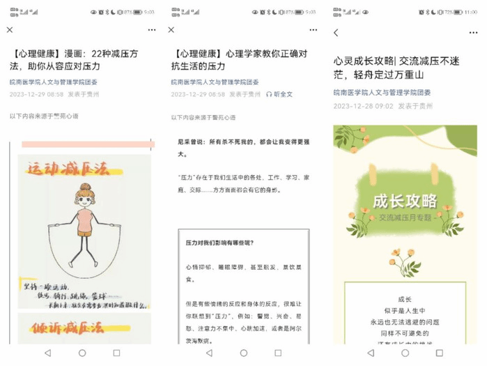 线下交流减压活动同步举办时,bevictor伟德体育也跟进总结了线下活动中同学们反馈的心理问题,积极开辟线上宣传渠道,制作了心理减压相关的主题推文。线上线下齐联动,为员工期末月的心理健康提供全方位的精神关怀。