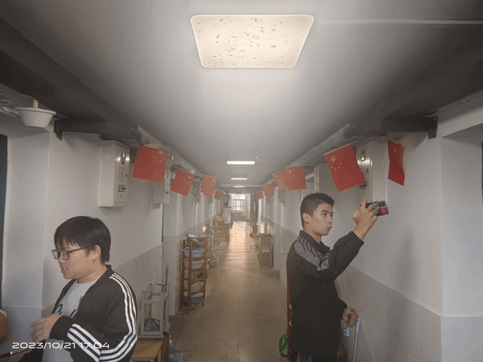 (员工自发将国旗悬挂在宿舍长廊)