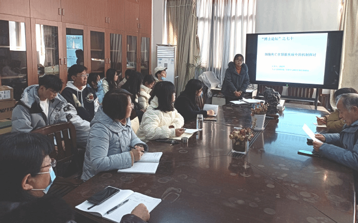 随后,邵德翠以“细胞焦亡在肾脏疾病中的机制探讨”为题作精彩报告。首先从研究背景、研究热点阐发,让与会人员初步了解“细胞焦亡”的新概念;其次。分别介绍和探讨了急性和慢性肾脏疾病模型的细胞和分子机制最新研究成果;再次,提出了相关课题设计的清晰思路。整场讲座内容丰富、语言生动,给与会青年教师、研究生和“启明星”小组成员留下深刻印象,并为该领域的创新思考带来崭新的感触与启迪。