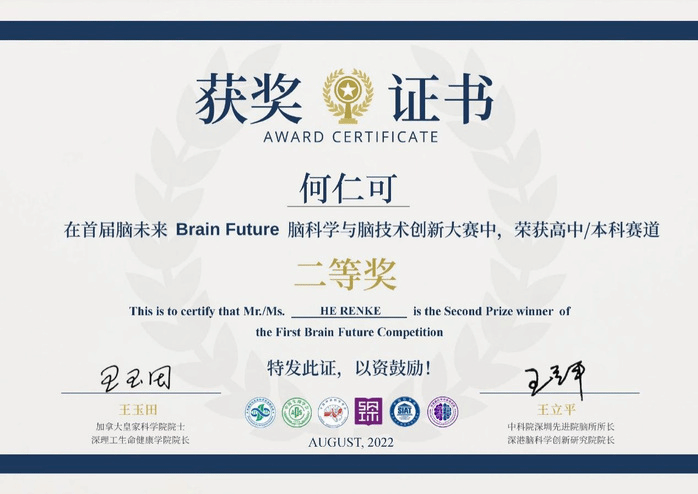 在总决赛启动仪式上,中国神经科学学会理事长、中国科公司张旭院士,以及中国生理学会理事长、北京大学王韵教授现场致辞,邀请多位知名神经科学专家担任大赛评委,决赛全程通过“中科院深圳先进院”公众号、“深圳商报”等在线直播。何仁可同学在线参加决赛,沉着冷静,表现优秀,充分展示了自己的学术成果、研究思路、特色亮点,彰显了“启明星”小组独特的创新思维能力和扎实的训练动手能力,受到了暨南大学的任超然教授等多位评委一致的高度评价。最终从本赛道12名选手中脱颖而出,荣获国家级二等奖(6名获奖人中位居第3名)。