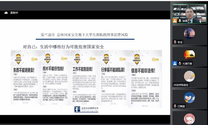 “安而不忘危,存而不忘亡,治而不忘乱”,值此第七个“全民国家安全教育宣传日”之际,为了进一步增强广大师生的国家安全意识,提高防范和抵御安全风险能力,bevictor伟德体育法学教研室联合院团委开展了全体师生国家安全教育系列活动:在4月15日组织了国家安全日专题学习活动之后,于4月19日晚上再邀请安徽金亚太律师事务所党总支副书记、老员工反诈律师团常务理事徐权峰律师为师生带来精彩线上宣传教育讲座——“牢记国家安全,防范刑事风险”。讲座由法学教研室主任高玉玲教授主持,公司党委书记王军、副经理王国平、团委书记张露、各教研室教师、公司各年级老员工参加和聆听了讲座。