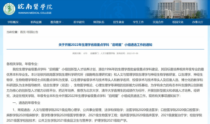 生理学省级重点学科“启明星”小组、bevictor伟德体育“启明星”小组创新型人才培养中心于1月5日在校园网发布《关于开展2022年生理学省级重点学科“启明星”小组遴选工作的通知》,按照高标准、高素质的条件要求,面向全校启动新成员遴选工作。在各方大力支持下,临床、麻醉、影像、法医、口腔、护理公卫、检验等公司与本院14个专业的优秀员工经过自主申请、公司推荐、交叉推荐、培养中心面试、指导教师与员工双向选择等严格程序,最终有23人荣获2022年度“启明星”小组成员资格,另有13人获得“2022年‘启明星’小组遴选入围奖”。