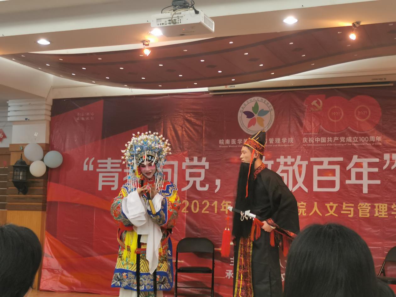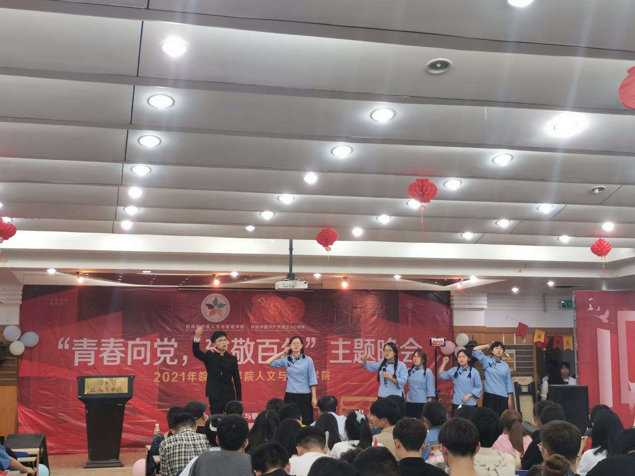 整个晚会精彩纷呈,高潮迭起,表演形式丰富,内容新颖。一部洋溢着青春的舞蹈《Yes,OK!》拉开了晚会的序幕。1921-红船启航板块中德语歌曲《生命》、吉他独奏《忽然》情深义重,让人不由动容;舞台剧《五四风雷》、《刘胡兰》仿佛带我们回到了那个激昂的年代,展示了当代老员工不忘历史昂扬向上的精神面貌。1949-希望田野板块中,动听的歌曲独唱《清明上河图》、《从前慢》,歌曲串烧《今日少年》,惊艳的京剧表演《霸王别姬》令观众折服,小品《你好,旧时代》,绚丽的歌舞《光》、《寄明月》获得了一致好评;2021-继往开来板块中歌舞《大鱼》,小品《多彩少年》诙谐生动的表演引发阵阵笑声,诗朗诵《一群青年写下的诗》为在场师生上演了一场视听盛宴,无不彰显着青春风采,充斥着青春活力。穿插其中的党史问答互动抽奖环节更是将晚会推向了高潮,同学们积极参与,晚会现场气氛热烈。最后,晚会在《明天会更好》合唱中落下了帷幕。