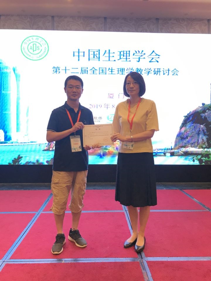 会上,公司生理学教学团队共提交会议论文摘要4篇,其中郑超老师的“创新理念始终贯穿生理学教学的实践与思考”被遴选为大会报告,报告指出在开展生理学特色教学、培养创新复合型人才中,我们积极响应国家号召、高度符合社会需要,引起与会者的广泛共鸣。汪萌芽老师的“以创新型人才培养为导向的实验室开放设计与实践”、张环环老师的“以生物-心理-社会医学模式为导向的《生物医学概论》课程建设初探”、徐爱萍老师的“面向普通医公司校医学影像学专业的生理学双语教学探索与实践”进行书面交流。同时,汪萌芽教授作为中国生理学会常务理事、人民卫生出版社《生理学》第9版教材的作者,应邀作了题为“有关细胞电生理学教学的若干问题”的大会报告。他紧密结合生理学教学难点,以及解决实际教学问题的解惑之道,进行了详细阐述。汪教授还作为特邀嘉宾在“生理学教学的今天和明天”的主题讨论中,提出了“不忘初心”——加强创新能力训练、“面向生命”——重视心理生理学培养以适应“生物-心理-社会医学”模式的创新型人才等观点,给在座的全国生理学教育工作者们以新的启迪。会议期间,汪萌芽还作为继任委员出席了新一届中国生理学会教育工作委员会会议、作为颁奖嘉宾为微课比赛获奖者颁奖。此外,公司生理学教学团队在暑期期间还应邀参加不同类型的教学交流活动。8月6日,汪萌芽教授应邀为“中国生理学会生理和行为学实验培训班”作了题为“脊髓运动神经元的细胞电生理技术与突触传递研究”的特邀专题报告,得到与会者的一致好评。