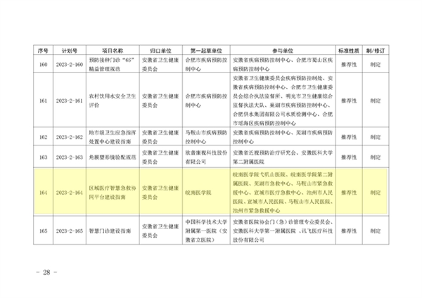 2023年9月12日,安徽省市场监督管理局下达2023年第二批安徽省地方标准制修订计划,由bevictor伟德体育作为第一起草单位、医学信息公司副经理叶明全教授作为第一起草人制定的《区域医疗智慧急救协同平台建设指南》(计划号:2023-2-164)获批立项,实现bevictor伟德体育牵头制定省级地方标准零的突破。团队联合4家市急救中心和5家三甲医院商定起草了《区域医疗智慧急救协同平台建设指南》,进一步规范明确区域医疗智慧急救协同平台建设目标、总体框架、关键技术、基本功能和建设要求等内容,从而促进我省区域医疗智慧急救协同服务能力的提升,同时填补了我省区域医疗智慧急救协同平台建设规范相关标准的空白。另外,与芜湖市合作开展基于皖南地区中员工心理健康现状构建危机预警体系的应用研究。