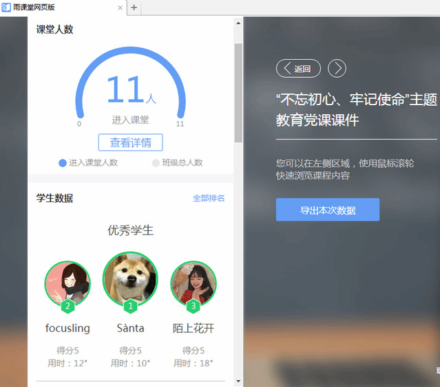 党课的内容为“重读习近平总书记金句,铭记共产党人的初心和使命”,课上利用雨课堂发送习题及弹幕功能,了解党员教师的学习状态,及时交流学习感受。