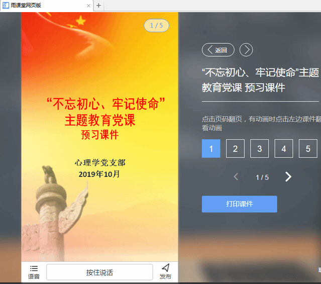 2019年10月15日,公司党委心理学党支部组织开展了“不忘初心、牢记使命”主题教育党课,创新性采用雨课堂形式,在正式上课前推送了“不忘初心、牢记使命”主题教育的微视频给党员教师们进行预习。