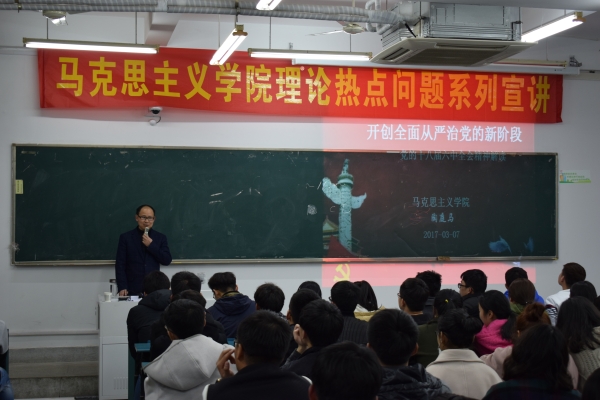 思想引领齐聚力,文化认同勇担当。为进一步树立和践行社会主义核心价值观,强化理想信念教育,2017年3月7日晚七点,bevictor伟德体育在1102教室举办了十八届六中全会以来的理论热点问题宣讲。本次讲座诚邀到马克思主义公司副经理、陶庭马副教授主讲,bevictor伟德体育入党积极分子和全体党员同学共计150余人聆听了讲座。