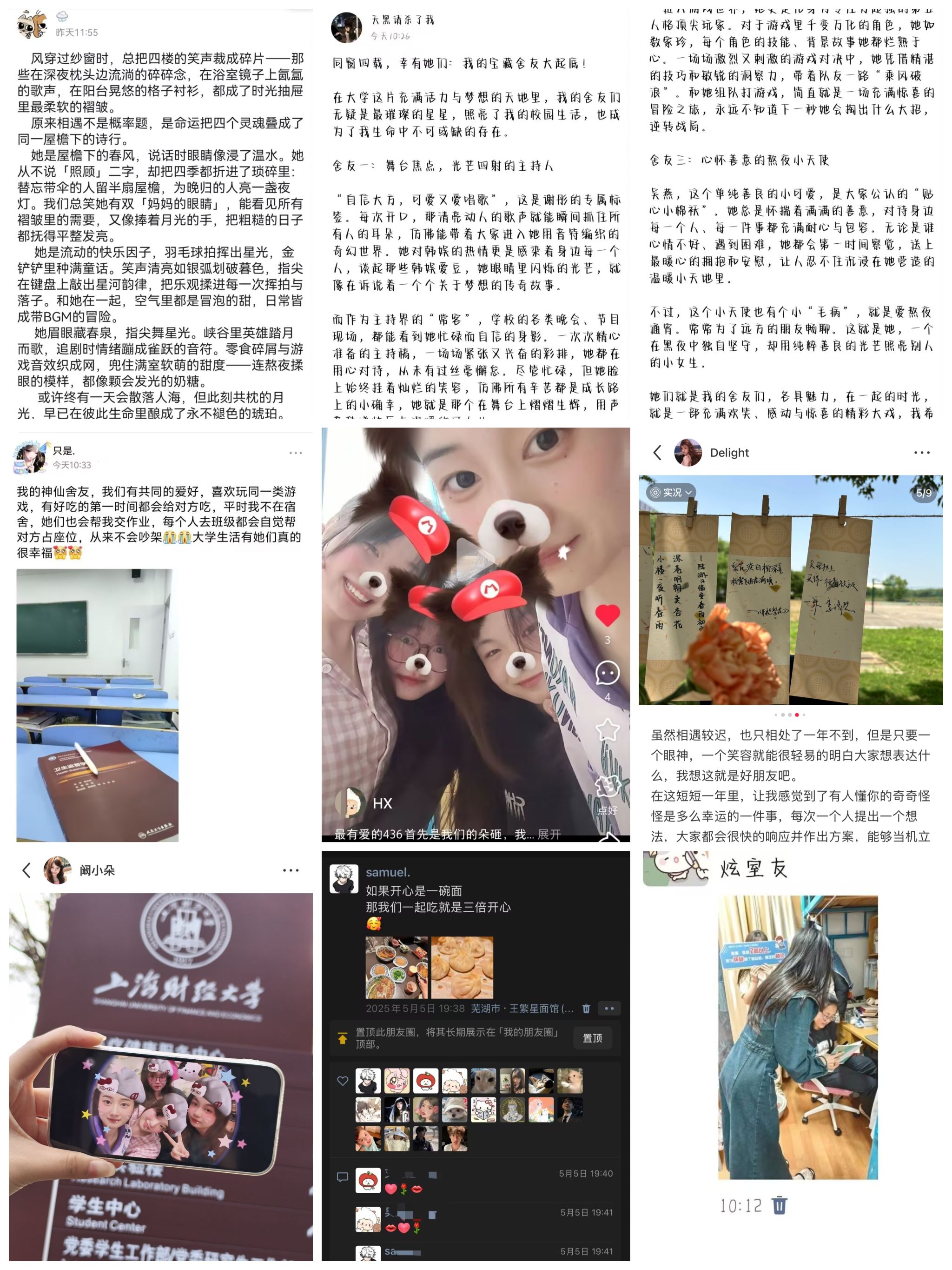 线上安利传递真情,图文定格温暖点滴。本次活动以“安利室友”为核心,参与者通过QQ动态、微信朋友圈、小红书、抖音等平台,用图文或视频记录与室友的温暖日常:或是一起熬夜复习时的加油打气,抑或周末聚餐时的欢声笑语。同学们将室友的闪光点与感动瞬间化作真挚文字,搭配趣味合影或创意短视频,向更多人“安利”自己的宝藏室友。活动截屏提交通道开通后,一张张生动截图承载着宿舍生活的珍贵记忆涌入后台,有人写下“感谢你包容我的小脾气”,有人相约“一起通过2025年法考”。这些朴实而真诚的表达,不仅让室友间的默契与关怀被更多人看见,更成为联结情感、重温共同成长轨迹的纽带。