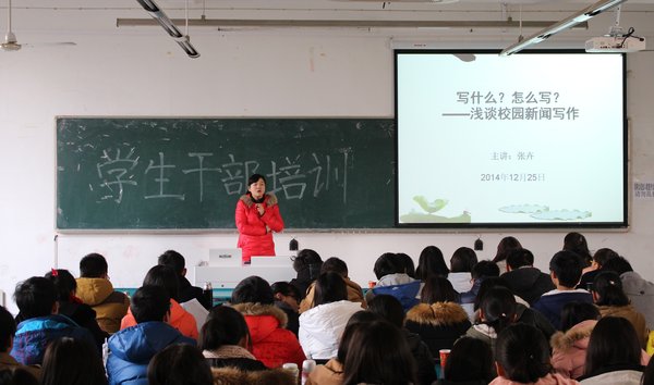 12月25日中午在西教学楼,校宣传部宣传科科长张卉进行校园新闻写作知识培训。张卉老师以校园新闻“写什么?怎么写?”为题,首先简要地从新闻的概念、价值、原则谈起,明确了校园新闻的写作立场和写作题材,接着重点从会议类、活动类、竞赛类、成绩表彰类详述了四种校园新闻常见类型,说明了四种类型新闻稿的结构、注意事项等;并且列举了一些错误和正确的新闻稿事例,突出了校园新闻存在的问题。几篇具有针对性的新闻稿案例的结合使同学们明白了如何使新闻稿写得更加规范、更具吸引力。